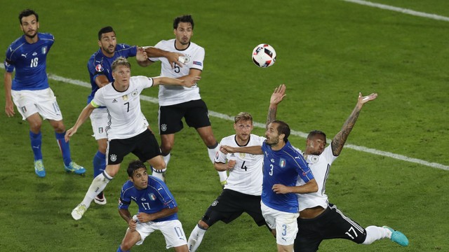 Poderia ter sido um dia com menos emoções para a Alemanha. Após o gol de Özil e uma defesaça de Buffon em lance entre Gómez e Chiellini, Boateng inexplicavelmente subiu para dividir com Chiellini com os braços totalmente abertos, em lance semelhante ao do brasileiro Thiago Silva na Copa América de 2015. Bonucci, que nunca havia cobrado um pênalti no tempo normal, assumiu a responsabilidade e empatou. A Itália melhorou, teve o seu momento, mas logo recuaria diante da dificuldade imposta pela pressão do time de Joachim Löw. Os alemães terminaram os 120 minutos com 11 finalizações, contra 7 dos italianos.