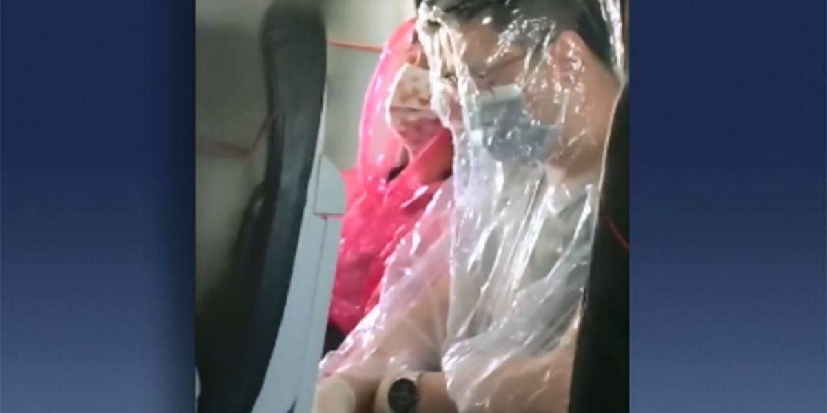 O medo por causa do surto de coronavírus causou uma situação inusitada durante um voo na Austrália. Uma passageira registrou duas pessoas envolvidas da cabeça aos pés em um plástico. Ambos ainda usavam máscaras e luvas de proteção.